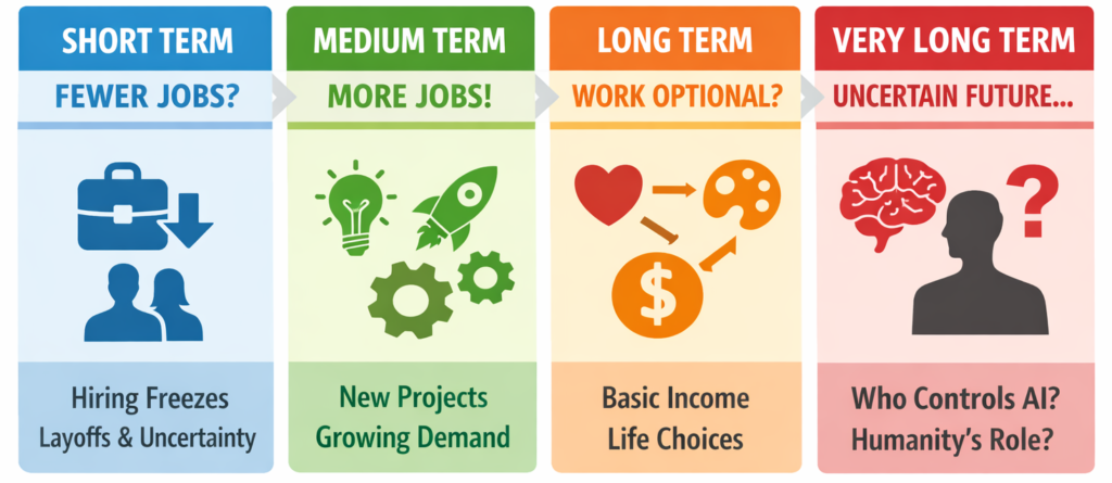 AI will not simply destroy jobs, and it will not automatically create them either. In the short term it brings uncertainty, in the medium term it opens new opportunities, and in the long term it changes what work even means.